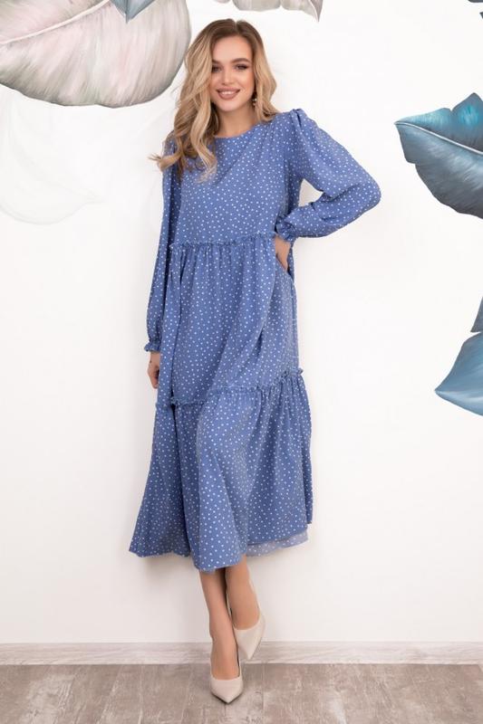12528_синий Синее платье-трапеция миди длины выполненное из софта в белый горошек и декорированное рюшами на ниспадающих воланах. Модель с полукруглой горловиной и длинными присборенными резинками рукавами.