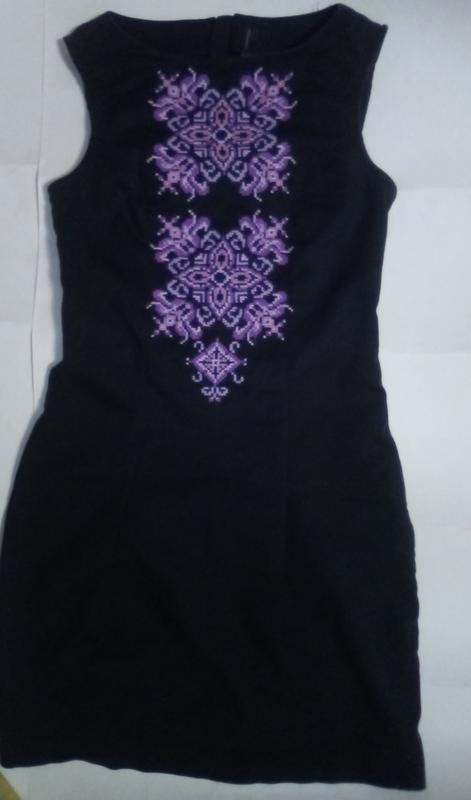 Размер 40-42. Ширина плечей 35 см, ширина в грудях 41 см, ширина в поясі 35 см, ширина в бедрах 45 см, ширина внизу 47 см. Довжина 83 см. Склад: 96% котон, 4% еластан. Сзади на молнии. Цвет черный. Орнамент вышит вручную.
