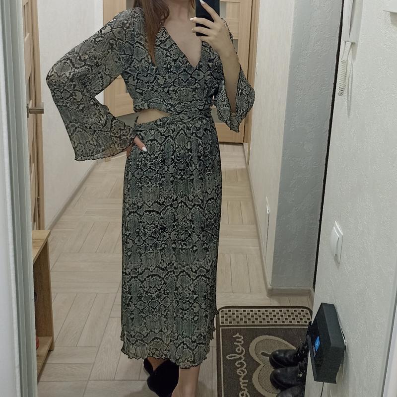 Полностью новое платье, мне не понравился размер. Платье миди с V-образным вырезом и длинными рукавами. Деталь выреза на талии. Контрастная подкладка. Потайная застежка-молния сзади.