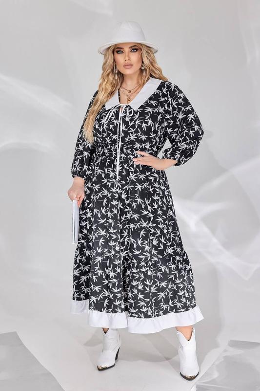 Платье миди с белым воротником синее чёрное голубое в принт листьев с рукавами фонариками...
