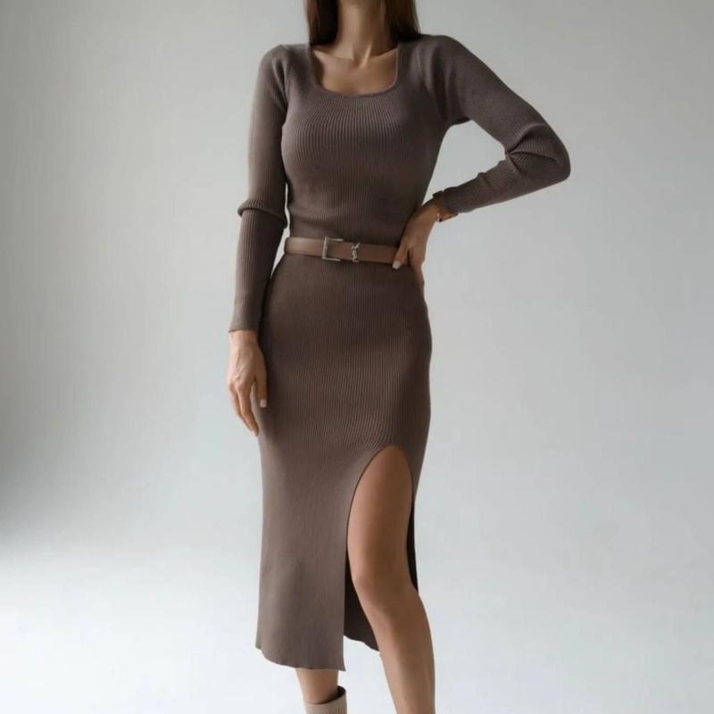 Сукня міді однотонна на довгий рукав з розрізом по нозі якісна стильна базова капучино зел...