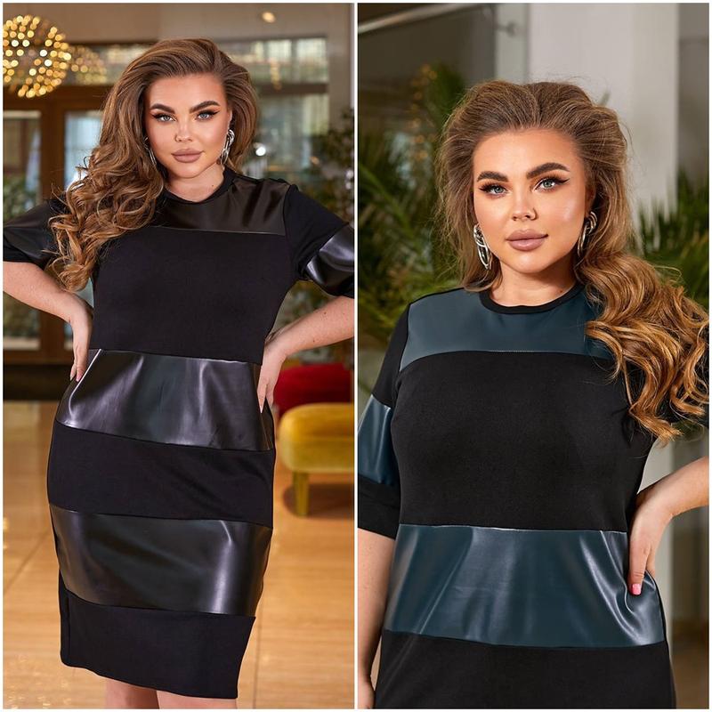 Комбинированное платье из эко-кожи и креп-дайвинга длиной миди больших размеров