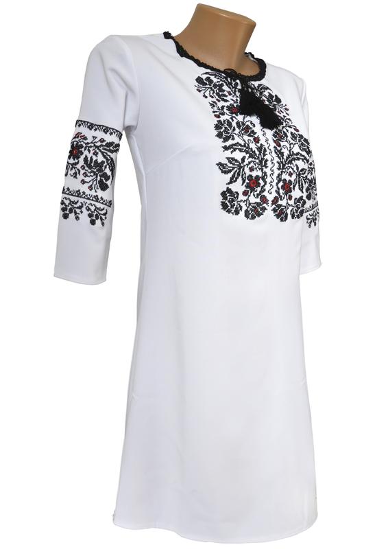 Власне виробництво роздріб та опт Вишивка вишита хрестиком, чорними акриловими нитками. Характеристика жіночої сукні з вишивкою Сукня доросла вишита Рукав 3/4 розмір 50-52 Орнамент - Модерн чорний тканина - Мадонна біла Товари в основному є в наявності, на складі. При відсутності товару пошив його займе 1-4 днів Параметри виробів можуть відрізнятись 1-2 см Вибираючи розмір орієнтуйтесь по розмірній таблиці, рекомендовано обхват – грудей має бути в виробі на 3-5 см більшим ніж обхват тіла. обхват – бедра має бути в виробі на 0-5 см більшим ніж обхват тіла.