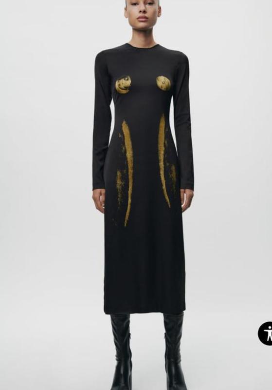 S в наличии по ценнику 69 евро из новых коллекций лишилась 1 шт замеры S: ног 41,5 см нот 34,5 см нос 47 см длина 126,5 см плечи 36,5 см рукав 65 см Длинное платье из смеси вискозы. Круглая горловина и длинные рукава. Контрастний силуетний принт спереду. Невидимая застежка-молния сзади. с официального сайта 96% вискоза 4% эластан