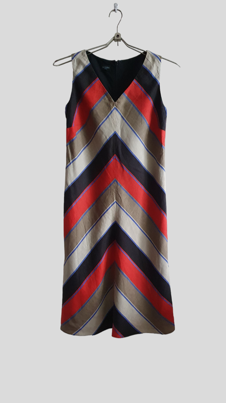 Платье приталенного силуэта в полоску на подкладке, сзади потайная молния. Платье в отличном состоянии. Состав: 100% лен, подкладка 100% хлопок. Размер указан 10 / M. См.замеры: ПОГ - 44 см, плечи - 33 см, ПОТ - 41 см, ПОБ - 46 см, длина по спине от плеча - 105 см, длина молнии - 56 см. По запросу сделаю дополнительные фото или замеры. Пересылка Новой или Укр почтой по предоплате или безопасная оплата.