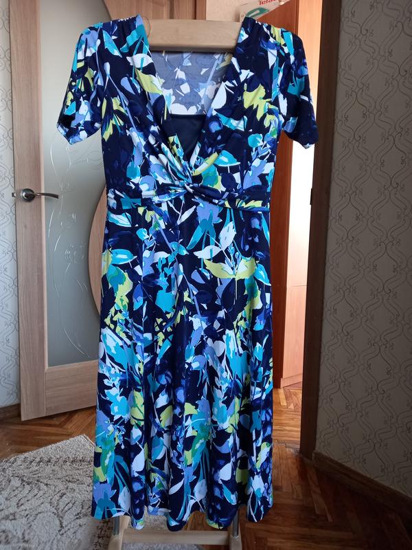 Практичное комфортное платье яркой расцветки. Чуть завышена талия. Не нуждается в глажке. Соответствует указанному размеру, тянется. Будет на 50-52 украинский. Длина 119 см. Плечи 40, пройма 23, длина рукава 23, ПОГ 50, ПОТ 42, длина до талії 37, ПОБ 60. Ткань эластичная, хорошо тянется. Платье идеально садится на любую фігуру, красиво ее подчеркивая, очень приличное на все случаи.