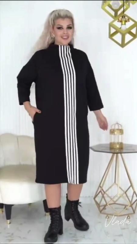 Платье Модель 917VL Цена : 830 грн Размеры : 46-48,50-52,54-56 Ткань : двунитка (хорошие качества), стрейчевые пришивные полоска (4 штуки) Свободное платье, из переда притачные четыре белых полоска; по бокам карманы, сзади молния Замеры изделия Размер 46-48: Объем груди 120 Объем талии 114 Объем бёдер 114 Длина рукава от шва 44 Длина платья по спинке 112 Размер 50-52: Объем груди 126 Объем талии 120 Объем бедер 120 Длина рукава 44 Длина платья по спинке 113 Размер 54-56: Объем груди 134 Объем талии 128 Объем бёдер 128 Длина рукава 44 Длина платья по спинке 114 Размер 58-60: Объем груди 140 Объем талии 136 Объем бёдер 136 Длина рукава 44 Длина платья по спинке 114