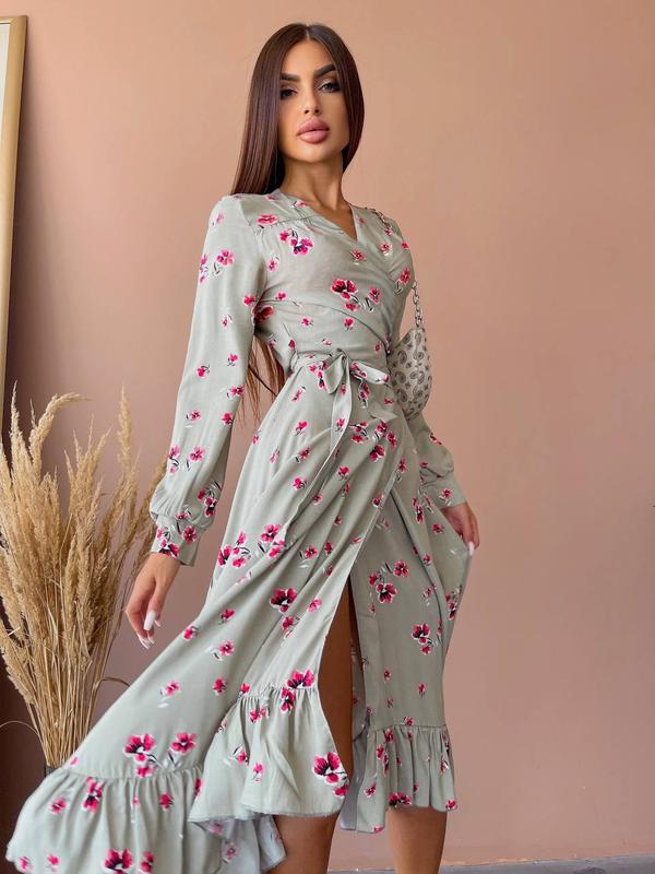Платье миди на запах платье в принт цветочек платье из штапеля ткань серый штапель в цветы...