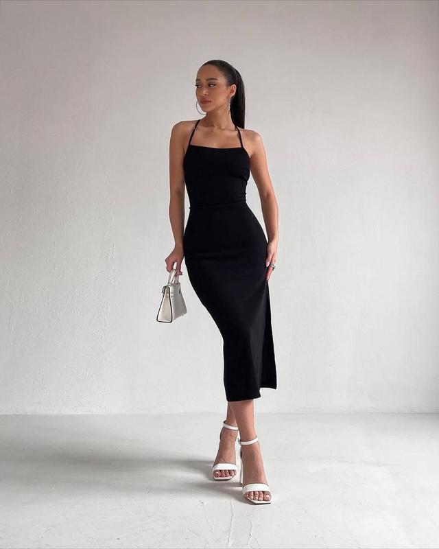 Приталенное платье миди с открытой спиной на завязках/ платье миди с разрезом на ноге/ пла...