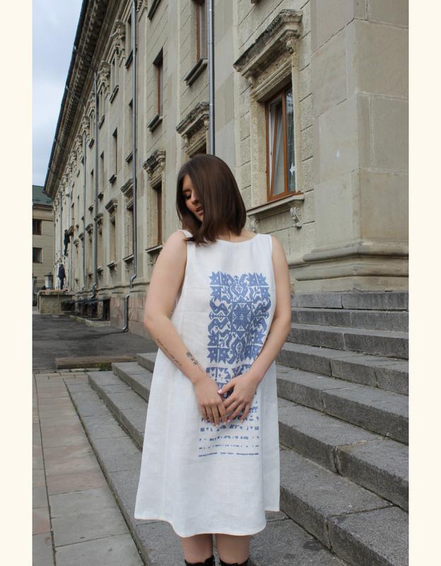 Сукня туніка літня лляна біла "zirka-блакитна" з ручною вишивкою без рукавів