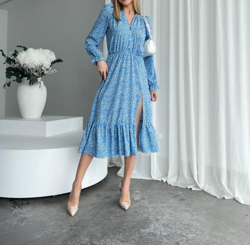 Трендова сукня у довжині міді з розрізом. Тканина: софт прінт. Кольори: бликитний у білу квітку, пудра. Розміри: 42-44, 46-48, 50-52.