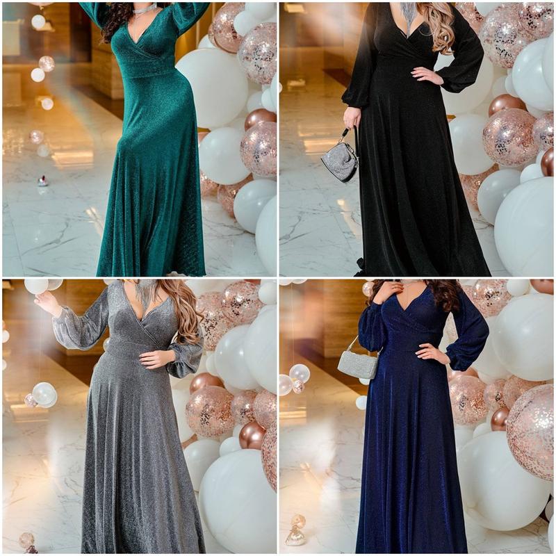 Мод №415 Платье Размеры: 46-48, 50-52, 54-56, 58-60, 62-64 Ткань: люрекс (хорошо тянется) Длина - 150 см Платье макси-длина с V-образным вырезом, молния по спинке. Цвета: серебро, черный, бирюза, электрик