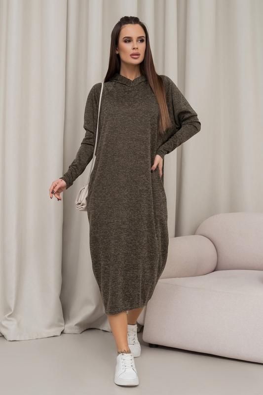 14466_хаки Ангоровое платье кокон цвета хаки с длинными рукавами-реглан кроя летучая мышь. Модель свободного кроя с карманами и длиной миди. Модель с защитным капюшоном.