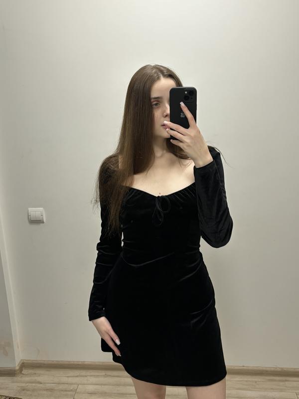 Очень изящное платье из бархатистой ткани. Красиво подчеркивает фигуру, выделяет швом грудь Приятная к телу. В идеальном состоянии, одевала всего один раз. Размер М. Ткань мягкая, тянется.