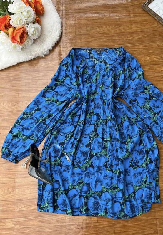 Платье миди свободный крой синее/голубое в цветочный принт.По талии отрезное,рукав широкий на резинке Довжина 37+61 Напівобхват грудей 58 по шву під грудьми 57 НО стегон 79 рукав 65 плечі 45