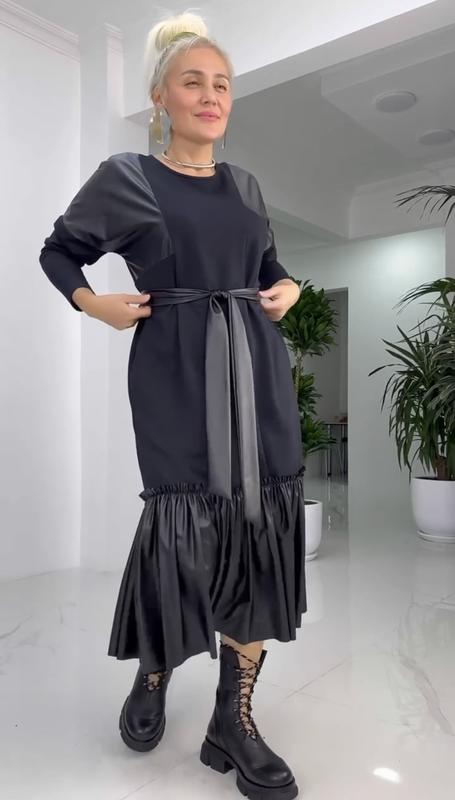 Платье Мод 81 Цена : 1450 грн Ткань: креп-дайвинг + эко кожу Размер:,50-52,54-56,58-60, 62-64 Цвет: черный 50-52 ОГ - 114 см, длина рукава от горловины 73 см, длина изделия - 127 см, ОБ- 124 см 54-56 ОГ - 122, длина рукава от горловины 73 см, длина изделия - 128 см, ОБ-132 см 58-60 ОГ - 130 см, длина рукава - 73 см, длина изделия - 128 см, ОБ- 140 см, 62-64 ог- 138 см, длина рукава от горловины 73 см, длина изделия 129 см, об - 148 см Ткань хорошо тянется