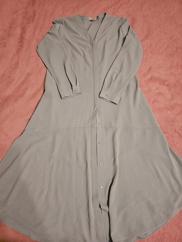 Невероятно красивое платье. Свободного покроя. По бокам есть разрезы и она короче на 10 см. Длина - 116. По бокам длина 106. Ширина у грудиг 50, в плечах - 40,длина рукава от плеча 60, от шеи 72. Полностью на пуговицах, но они скрыты тканью. Свободное. Может быть и на М и на L.Цвет оливковый.
