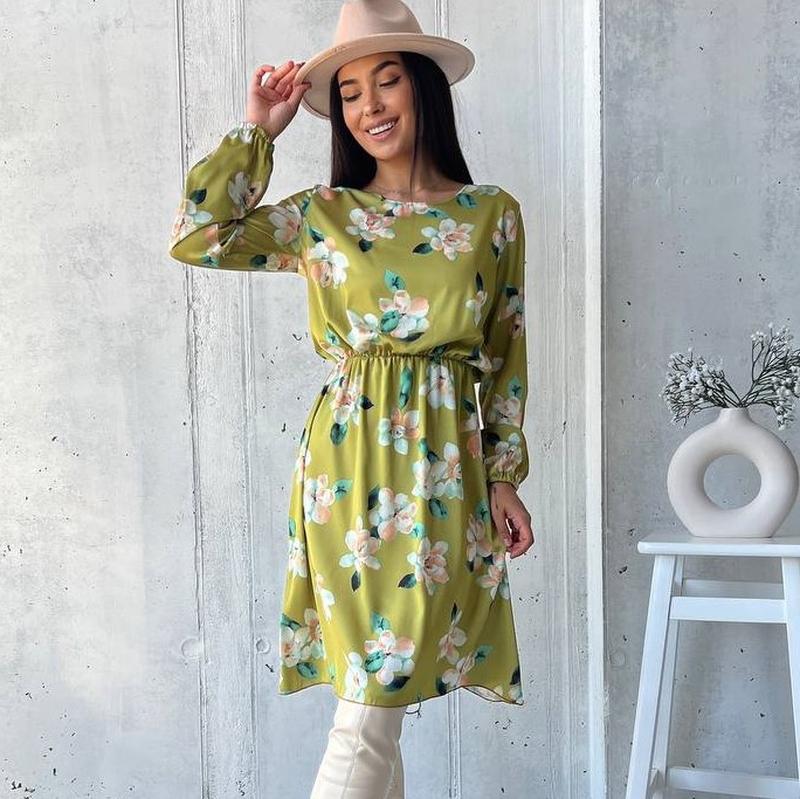 Легкое летнее платье женское оливковое в цветок короткое коктейльное платье с рукавом своб...
