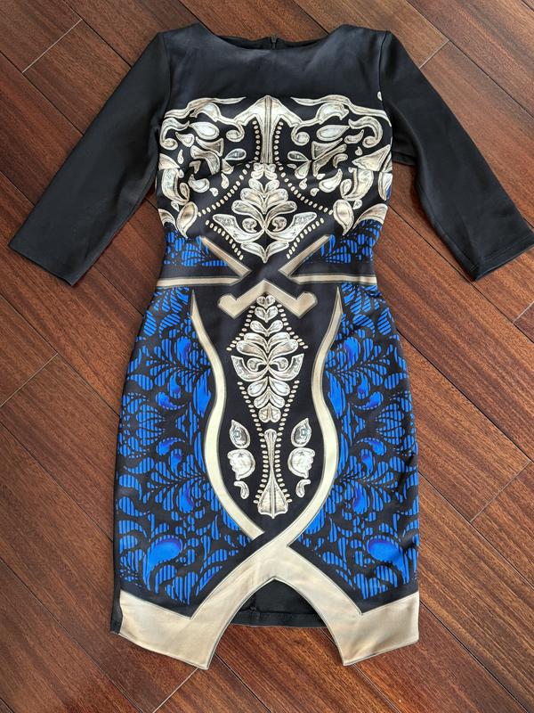 Интересное платье с вырезом. В хорошем состоянии. Замеры: Длина сзади 84 см, перед кромка 91 см ПОГ 38 см Плечи 34 см Рукав 38 см Талия 33 см Бедра 40 см