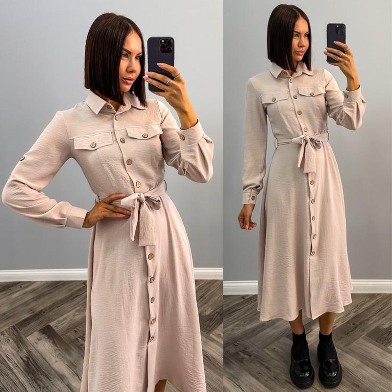 Арт. SV 418...29.02во Тканина: креп-жатка Цвет: бежевый, хаки, черный Размеры: S, M, L, XL, 2XL Описание: Платье-рубашка макси длины с боковыми разрезами. Модель с накладными карманами, рукав регулируется патиком, застегивается на пуговицы по всей длине. ( замеры указаны на параметры)
