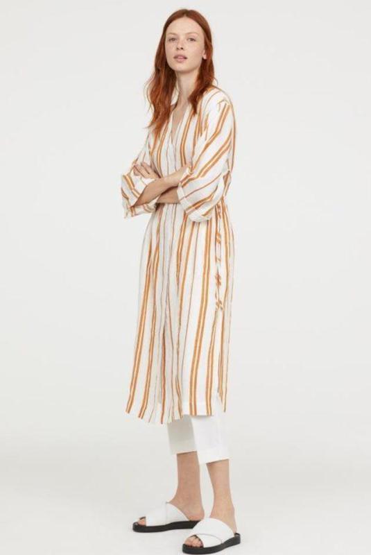 Якісне смугасте міді плаття сорочка H&M з льону, віскози і ліоцелла. Спереду застібається на ґудзики, приховані планкою. В поясі затягується шнурками. По боках кишені. Рукава підвернені. Знизу з боків розрізи по 39 см. Розмір в наявності XS, відмінно підійде і на М. Дивіться за замірами: XS: ПОГ 59 см, є витачки ПОТ 58 см ПОС 59 см Довжина 119 см Плечовий шов 14,5 см Рукав 41 см Ширина в плечах 44 см Склад: Льон 56%, віскоза 31%, ліоцелл 13%.
