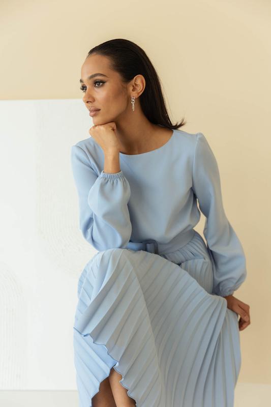 Материал - костюмка Цвет - голубой Фурнитура - пряжка, резинка на поясе Фасон - прямой, свободный Сезон - демисезон, весна, осень Декоративные элементы - плиссированная юбка, пояс с пряжкой. Конструктивные элементы - разрезная талия, резинка на рукавах Комплектация - платье, пояс Уход за одеждой ручная стирка до 30° Длина изделия S-M=115 см L-XL=113 см XXL-3XL=111 см Длина рукава S-M=62 см L-XL=63 см XXL-3XL=65 см Длина брюк S-M=72 см L-XL=770 см XXL-3XL=68 см