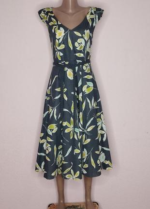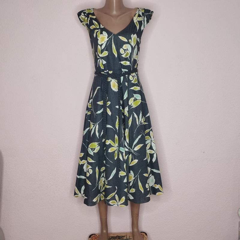 Красивое с ярким принтом платье в романтическом стиле от Laura Ashley. Идеальный крой, качественный пошив Имеет боковую застежку на молнии, пасок. Склад тканини - 55%- льон 45%- бавовна. Тоненькая хлопковая подкладка. Состояние новой вещи. Без нюансов. Размер указан европейский 34(8). Замеры: ШП-37 Крыло-5 ПОГ-45 ПОТ-36 ПОБ-64 ПОНИзу- 140 Длина по спинке -112 см.