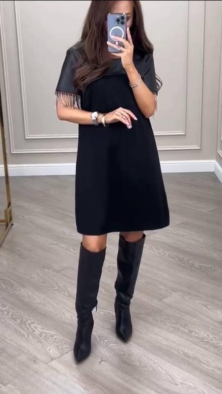 Сукня Модель: 0564 Ціна: 1200грн Колір: чорний. Розмір: 42-44,46-48,50-52 Тканина: Костюмка+еко шкіра. 0564 42-44 Об г - 96 Об б - 106 Дл и - 91 Дл р - 17 46-48 Об г - 104 Об б - 112 Дл и - 92 Дл р - 18 50-52 Об г - 112 Об б - 118 Дл и - 93 Дл р - 19