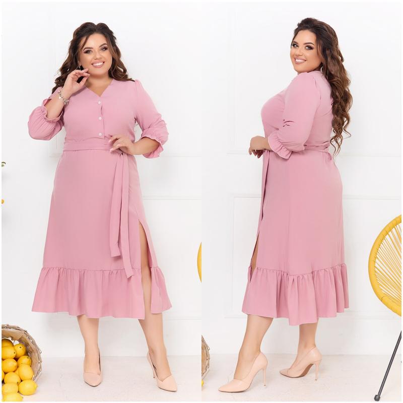 код 3499 Тканина: софт Цвет: пудра Размеры: 52-54, Длина платья: 127 см Длина рукава: 48 см. Обхват рукава: 40 см Высота разреза: 45 см Замеры готового изделия: 52-54 ОГ109 ОТ 64/109 ОС 124 Невероятно женственное платье в романтичном стиле из нежного и легкого софта. По линии талии отрезная, собранная на резинку. Лиф застегивается на пуговицы до пояса. Рукава 3/4, по низу встречи на резинку. По низу юбки платье декорировано воланом. По левой ноге один разрез. Пасок из основной ткани идет в комплекте.