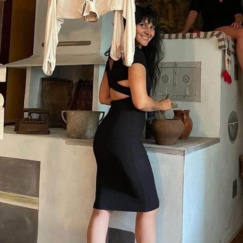 дуже стильна,тканина утяжка,спереду закрита,ззаду перехресний виріз,довжина міді.Підійде на xs-s.