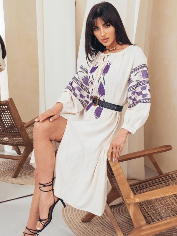 Плаття-сорочка з високоякісного турецького матеріалу вільного крою з вишивкою. Модель із довгими рукавами-регланами на манжетах. Кругла горловина доповнена зав'язками.