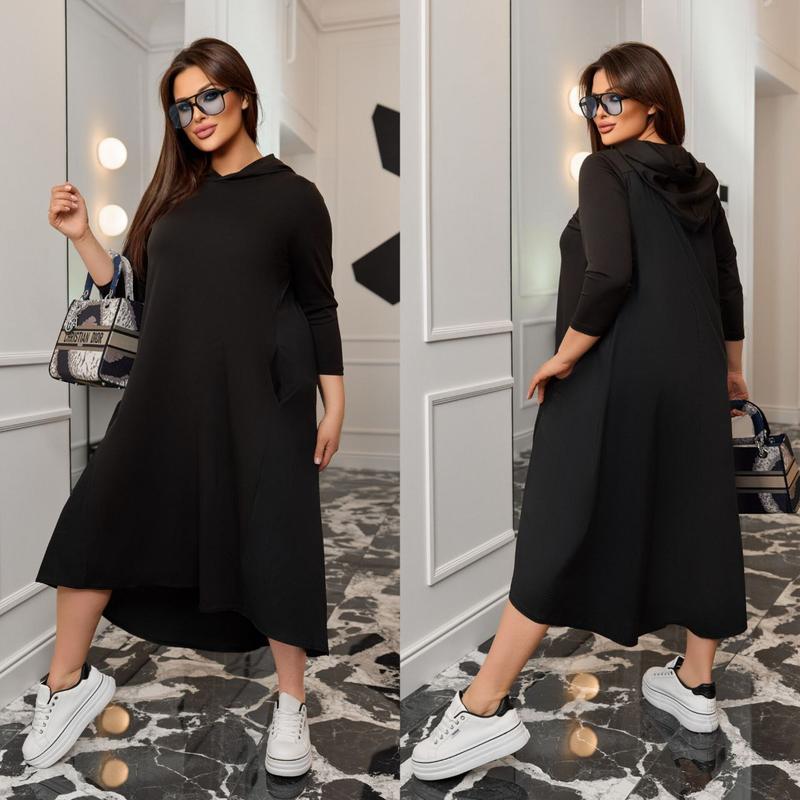 ❤️Сукня в стилі спорт шик Модель 120 ⭐️Розмір: 48-52, 54-58, 60-64 ✔️Ціна: 950 грн Тканина: трикотаж мікродайвінг+ котон (поплін) Дуже гарна якість!🔥 Стильна сукня в стилі спорт шик. Має асиметричний крій, бокові кишені, капюшон. Тканина тягнеться. ✅Виміри: 🟢48-52 Обхват грудей 112 см Обхват стегон 144 см Довжина рукава 49 см Довжина виробу попереду 113 см,позаду 128 см 🟢54-58 Обхват грудей 122 см Обхват стегон 148 см Довжина рукава 50 см Довжина виробу попереду 113 см,позаду 130 см 🟢60-64 Обхват грудей 132 см Обхват стегон 166 см Довжина рукава 51 см Довжина виробу попереду 113 см,позаду 133 см оксам