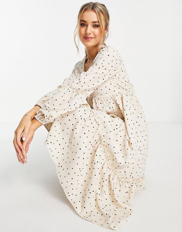 Ніжна сукня в горошок Asos (In The Style) Стан новий з паперовою біркою Колір нюдовий Є відео із сукнею на моделі Розмір пише 18, але маломірить, краще на 14/16 Дивіться заміри: Пог 56 не тягнеться Пот 50 ззаду резинка Плечі 42 Рукав 65 довжина 124.