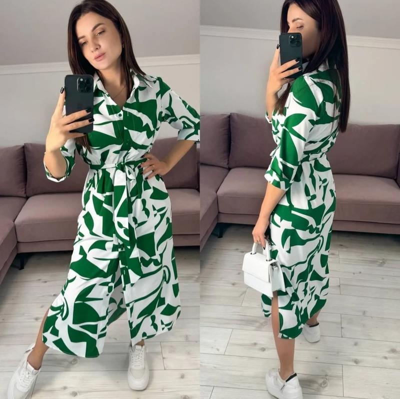 Арт 511 Тканина: супер софт Розмір: 42-44, 46-48, 50-52 Колір: чорний, зелений, малиновий, електрик Сукня сорочка, застібається на гудзики, рукав 3/4, з боків розрізи, комір стійка. Пояс з тканини входить до комплекту!