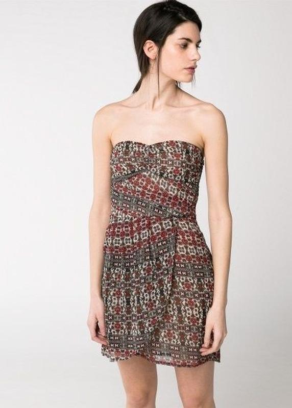 Плаття без бретелей з принтом, виконане з шифону, з драпірованим декольте і присобраной спиною. Спідниця з запахом, бічне кріплення на блискавці. Є внутрішня підкладка.