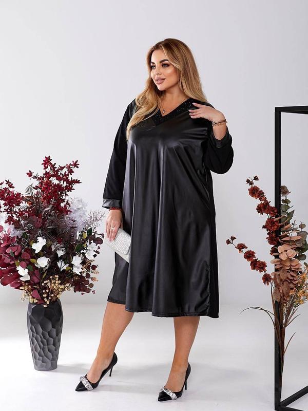 Сукня Модель: 107 Розмір: 50-52, 54-56, 58-60 Ціна: 1200грн Тканина: екошкіра на трикотажній основі + крепдайвінг Колір: чорний Стильна сукня трапеція. Рукав 3/4. Виріз прикрашений стразами. Тканина тягнеться, гарна якість!