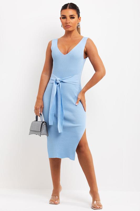 Платье миди в рубчик с завязкой на талии небесно-голубое р.s
