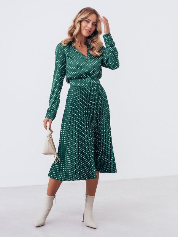 Платье зеленое плиссе в принт горошек. Длинный втачной рукав с пуговицей на манжете. Изделие с планкой спереди и воротником-стойкой. Вдоль талии предусмотрена эластичная деталь. Комплектуется поясом из основной ткани с пряжкой. Материал/состав: искусственный шелк (100% полиэстер); Растяжимость: нет; Длина изделия: 113 см; Длина рукава (от плечевого шва): 62 см; Параметры модели: 88х66х95, рост 170 см; На модели представлен 44 размер. ❗ Все заказы оформляются только через ЧАТ, через кнопку КУПИТЬ ➡️ отклонены. Страна производитель ➡️ Украина. 🚛 Доставка ➡️ "Новой почтой" (2-3 рабочих дня). Доставка сплачивает покупатель. 👛 Оплата ➡️ 100% Передача на р/р ФОП "ПриватБанка" или после платья с авансом. Если посылку не забираете, аванс возвращаем по учету транспортных расходов в обе стороны. 📦 🔁 Обмен и возврат ➡️ за счет покупателя, при наличии оригинального и невредимого упаковки и ярлыков, отсутствия следов эксплуатации, стирки и ношения.