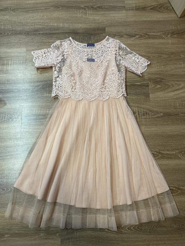 Плаття в персиковому кольорі, в розмірі 42, ширина в талії 74 см, довжина 93см, зверху йде мереживна накидка довжина якої 35см а ширина 45
