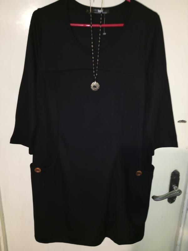 Трикотажное-стрейч,довольно плотное (не футболочная ткань),бохо,чёрное платье-туника с большими карманами и деревянными пуговицами ,Bonprix.Размер evr 40/42,но ориентируйтесь по замерам: длина от плеча 92см,ПОГ- от подмышки до подмышки -50/63см,ПОТ-53/66см,ПОБ-условно-60/73см,ПО по канту 59см тянется до ПО 71см,длина рукава 47-48см,ПО бицепса 17/25см Одето пару раз,из нюансов: вероятно,укорачивали,очень аккуратно подложен кант, без катышков и дефектов. Женственное и приятное к телу. См.др.объявления-есть аналогичные блузы и очень много нарядной,вечерней и не только одежды-больших размеров. Подписывайтесь,обновления вещами "королевских" размеров и не только-каждый день. Спрашивайте,уточняйте,сделаю дополнительные фото-возврата нет-объявления платные. Покупая несколько товаров-Вы экономите на пересылке, лоты комбинируются в одну посылку. Перед покупкой-просьба:ознакомиться с рубрикой "ОБО МНЕ" Состав: бирка срезана: трикотаж Доставка: Перешлю в др.города-за Ваш счёт-при полной оплате на карточку