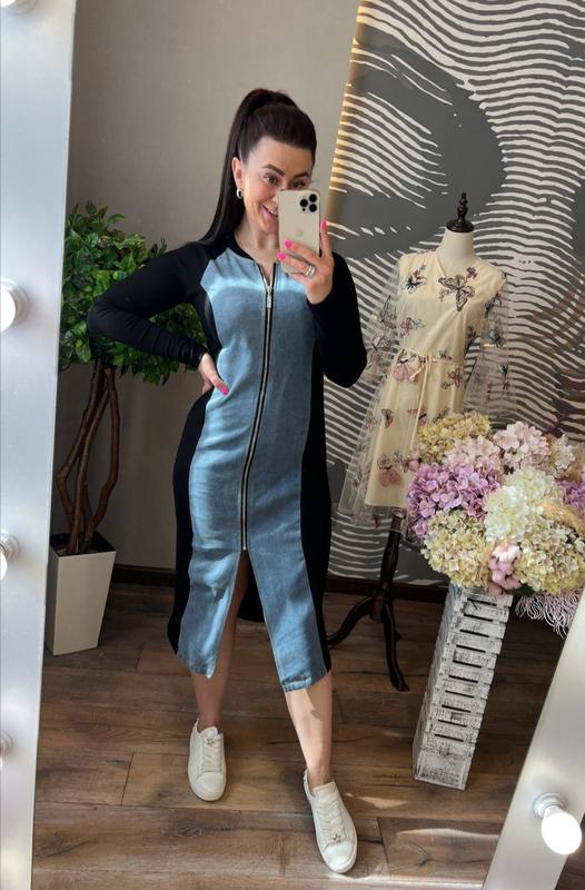 денім з трикотажем у сукнях модний тренд цього сезону, тандем цих матеріалів дарують нам комфорт і гарний настрій сукня облягаючого крою з довгими рукавами, витонченим вирізом спереду, що переходить в довгу блискавку-замок і елегантним розрізом спереду, підкреслять красу і переваги вашої фігури, сукня виготовлена з щільного трикотажу та літнього деніму, вона відмінно поєднується із взуттям та аксесуарами різних стилів і кольорів. розміри: С , М , Л С-42 довжина 117-118 см, н г 41-42 см, довжина рукава від шиї 68 см М- 44 довжина 117-118 см, н г 42-43 см, довжина рукава від шиї 70 см Л- 46 довжина 117-118 см, н г 44-45 см, довжина рукава від шиї 70 см код 0571