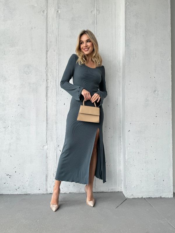 Новинка ❤❤❤ Вишукана довга сукня з зав’язками по спинці та з розрізом на нозі Модель 3062 Розміри: 42-44,46-48 Тканина:доброякісний турецький рубчик Кольори: шоколад, чорний,  графіт, сірий Заміри: 💛Обхват грудей (42-44)-84см (46-48)-90см 💛Обхват талії (42-44)-64см (46-48)-70 см 💛Обхват стегон (42-44)-80 см (46-48)-88 см 💛Довжина 135 см 💛Рукав 65 см Тканина дуже добре тягнеться 💕