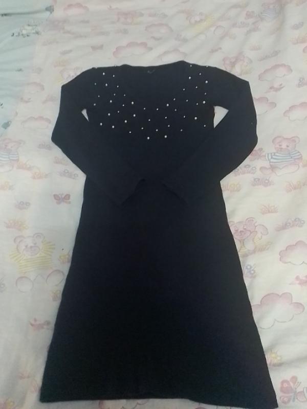 платье темно синий цвет, в рубчик, приятное к телу,, длина 83, пот 33 поб 36, материал тянется., перед обделан бусинками.