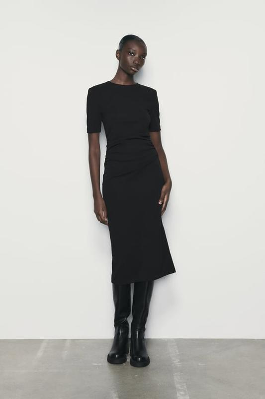 Платье миди с круглым вырезом и короткими рукавами с подплечниками. Боковые детали драпировки. Молния сзади спрятана в шве. Материал: 96% полиэстер 4% эластан длина = 127 см ог = 48*2