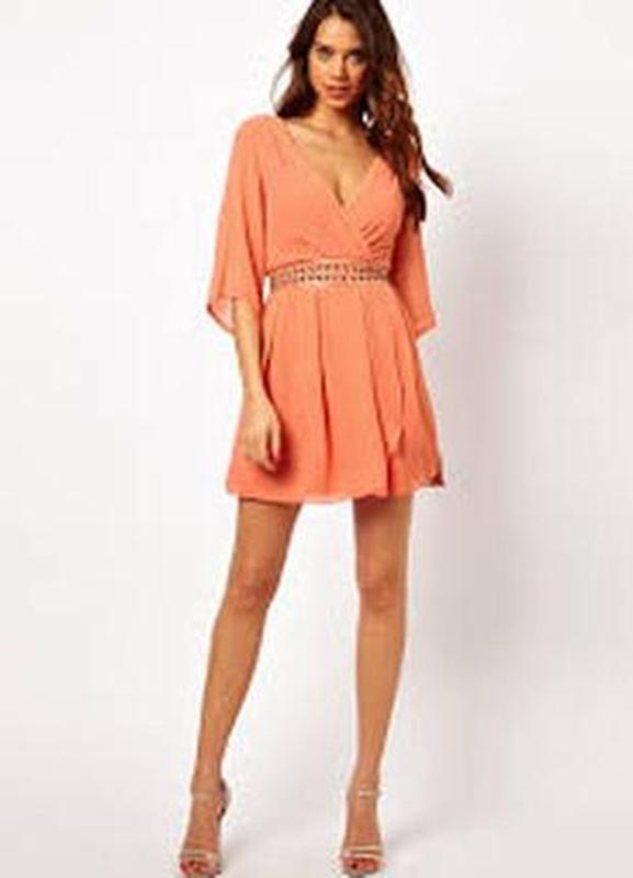 Дуже красива, шифонова сукня. Рукава 3/4. V-образный вырез горловины. , мягкий пояс сзади завязывается. Спереди имитация запаха.На эластичной подкладке. Не просвечивает. Красивый, коралловый цвет. Цвет как на первом фото и фото на маниконе. Новое состояние. ПОГ-42, Длина - 89 ПОБ-50 по подкладке.
