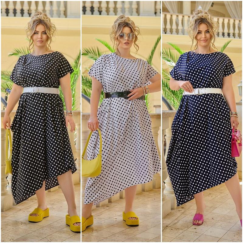 Мод#904 (ал-коз) Платье "Ассиметрия горошек" Размеры: 48-50, 52-54, 56-58. Размеры идут спаренные. Ткань: Летний софт горошек, хорошего качества + пояс в комплекте. Дополнительные характеристики: Сезон: Лето. Свободного покроя, с ассиметрией по бокам и рукавам. С одной стороны идет вывернутый карман, если его завернуть внутрь- то получатся хорошие фалды. так же можно карман носить вывернутым, что придает платью не обычный крой и современный стиль дизайна. Платье подойдет как на каждый дневной выход в свет, так и для торжества. Хорошо компонуется под любой стиль обуви. Цвет изделия: Синий. Черный. Белый. Фактические измерения: По 48-50 размерам. Длина от плеча с одной стороны - 140 см. С другой стороны - 104 см. Рукава от горловины - 29/21 см. (Ассиметричный). ОГ-122 см. ОТ - 140 см. ОБ - 160 см. К каждому последующему размеру прибавлять + 4см (на единичные размеры). На спаренные +8см, кроме длины изделия. Рост модели на фото-170см. На модели одет: 48-50 размер. Параметры модели на момент съемки: БРЮНЕТКА: ОГ: 104 см. ОТ: 80 см. ОБ: 110 см. БЛОНДИНКА: ОГ-110 см. ОТ- 83 см. ОБ- 116 см.