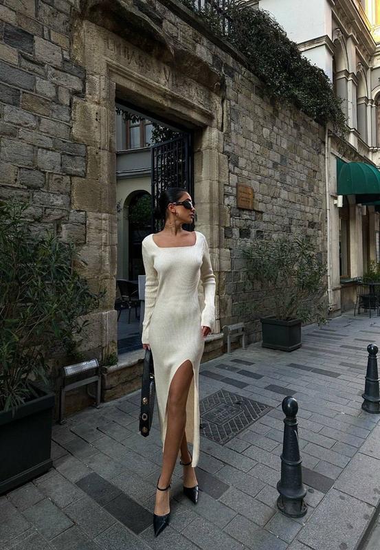 Элегантное платье длины миди. отличается классическим прилегающим силуэтом, глубоким квадр...