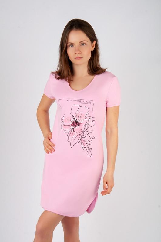 Новинка сезону - жіноча домашня сукня. Зручна та комфортна модель з коротким рукавом, з овальним вирізом горловини, по переду нанесений стильний накат, який виконаний методом шовкотрафаретного друку. Сукня виконана з дуже м'якого, тонкого, приємного на дотик бавовняного трикотажного полотна. Полотно: стрейч-кулір Склад: 95% бавовна, 5% еластан ,,3355