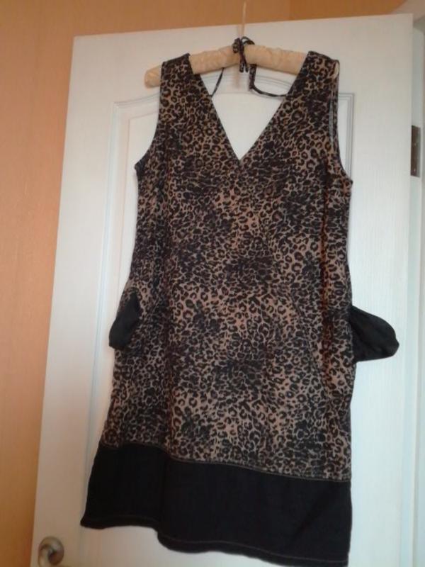Цвет красивый насыщенный черный,темно и более мировой коричневый.Принт анималистичный.Состав 55%лен,45%вискоза.Мягкая и комфортная.Качество льна и пошива достойное.Два боковых кармана.Комбинированная черная полоса внизу.Два V-образных ворота.Ззада на завязках.Р Размер 12.Эвр 40.Замеры ПОГ 51см.Длина 95см.Полуширина внизу 56см. Модель ровная. Сделано в Бангладеш.Стан идеален.