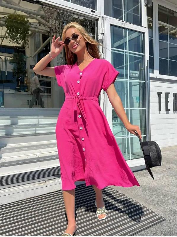Колір: малиновий Тканина: креп-жатка Довжина: 115-117 см Зріст моделі: 169 см Додаткова інформація: сукня з кишенями, по всій довжині застібається на гудзики, Сезон: літо Виробництво: Україна